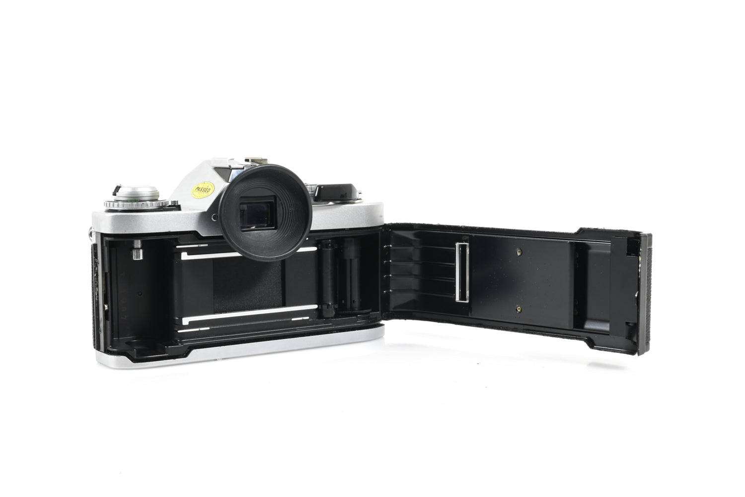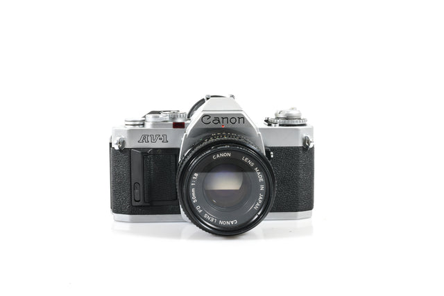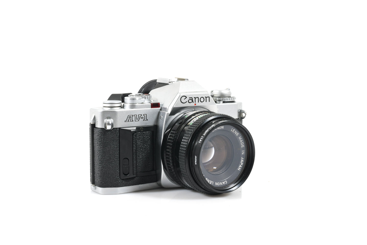 The AV-1 is very similar to the 1976 Canon AE-1 but provides aperture-priority autoexposure rather than the AE-1's shutter speed priority AE. The camera is not capable of full manual exposure. Featuring a sharp 50mm lens and needle-based light meter, this camera is perfect for students, amateurs, or professionals.