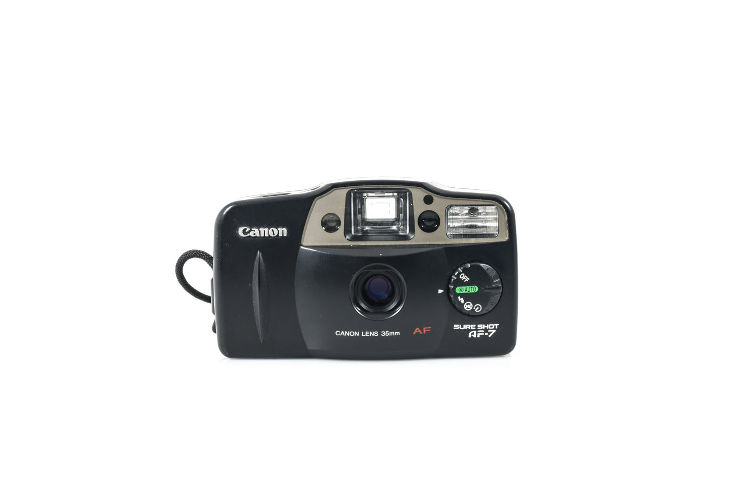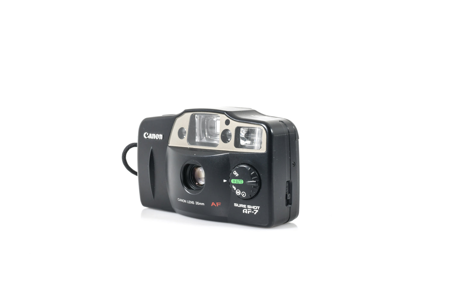 This Canon Sureshot AF-7 35mm Point and Shoot Film Camera is easy to use and maintain. Featuring a powerful flash and self-timer, this point-and-shoot camera is perfect for life on the road. This camera can use color film or black and white. This camera has an automatic winder.
