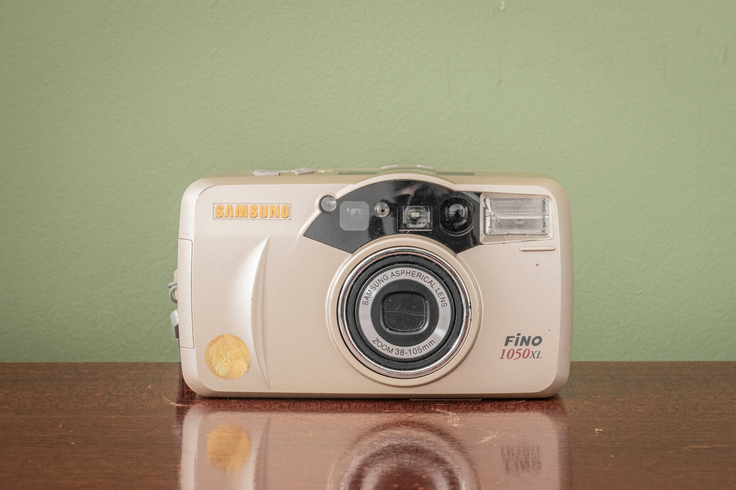 This Samsung Fino 1050XL 35mm Point and Shoot Film Camera is easy to use and maintain. This camera is a lightweight 35mm point-and-shoot film camera that uses all types of 35mm film. Featuring a bright flash, stylish gold trim and automatic winder, this camera is the one for you. This camera is perfect for travel, lifestyle, parties and more!