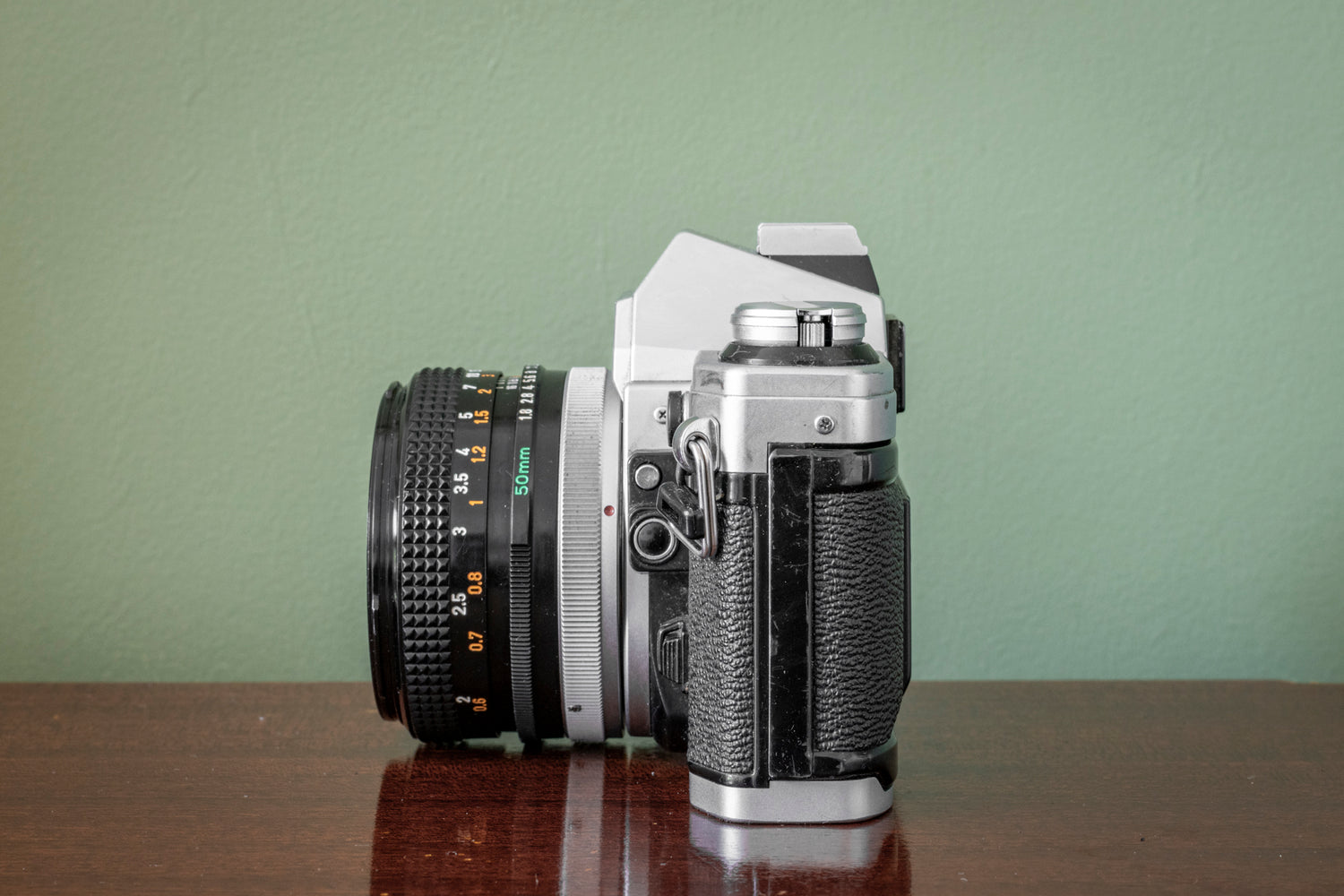 Stunning 1980s Canon AE1 35mm SLR Film Camera + Canon 50mm F1.8 FD S.C. Lens - Silver