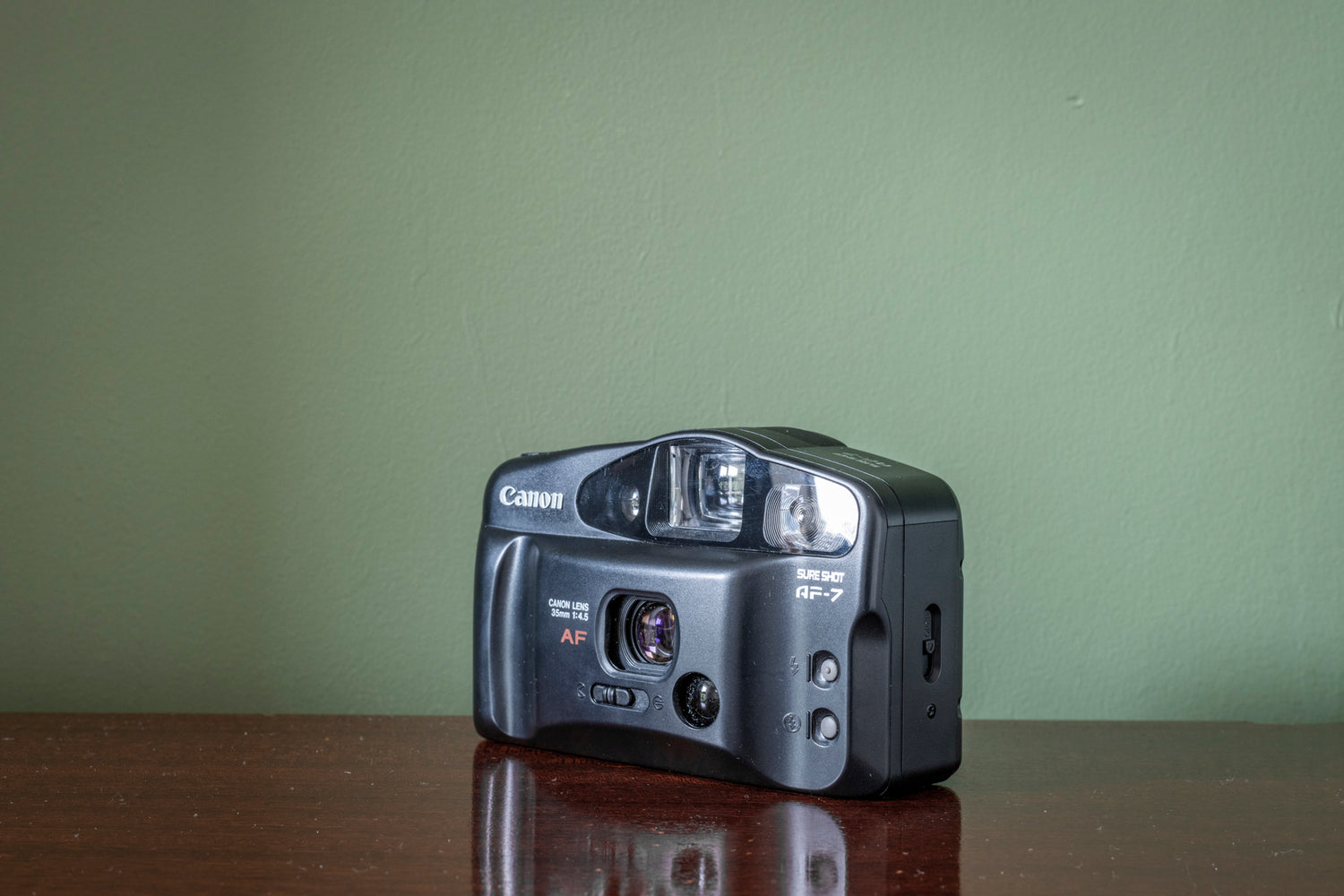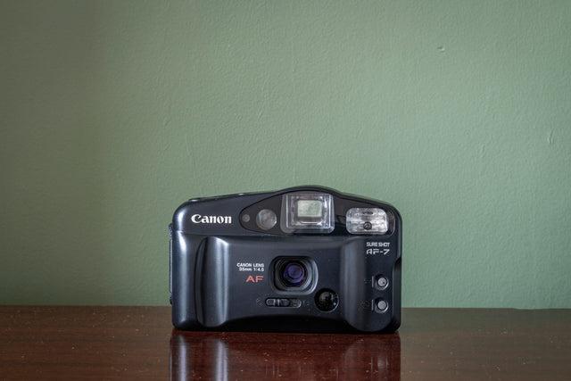 This Canon Sureshot AF-7 MK I 35mm Point and Shoot Film Camera is in brand new or near new condition and comes in its original box ( box not photographed ). This camera has been cleaned and tested and comes with our 60-day money-back guarantee. It may have a few minor cosmetic marks due to the time it has been in the box.