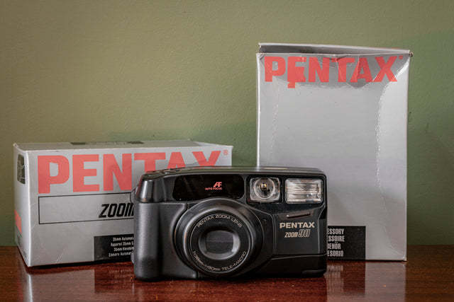 This * Special Buy * Boxed Pentax Zoom 90 Point and Shoot 35mm Film Camera is in great overall condition. It comes in its original box with inner insert boxes. It also comes with all user manuals. This camera comes with our 60-day money-back guarantee.