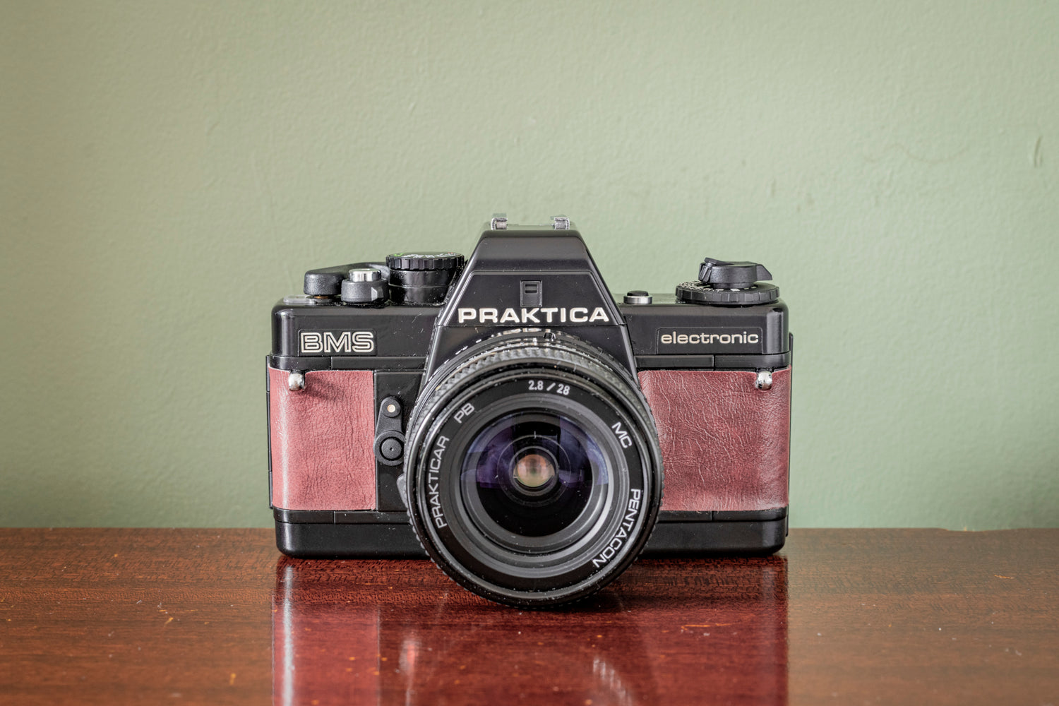 Gorgeous Praktica BMS 35mm Film Camera + Practicar 28mm F2.8 Lens ( Red Leatherette )