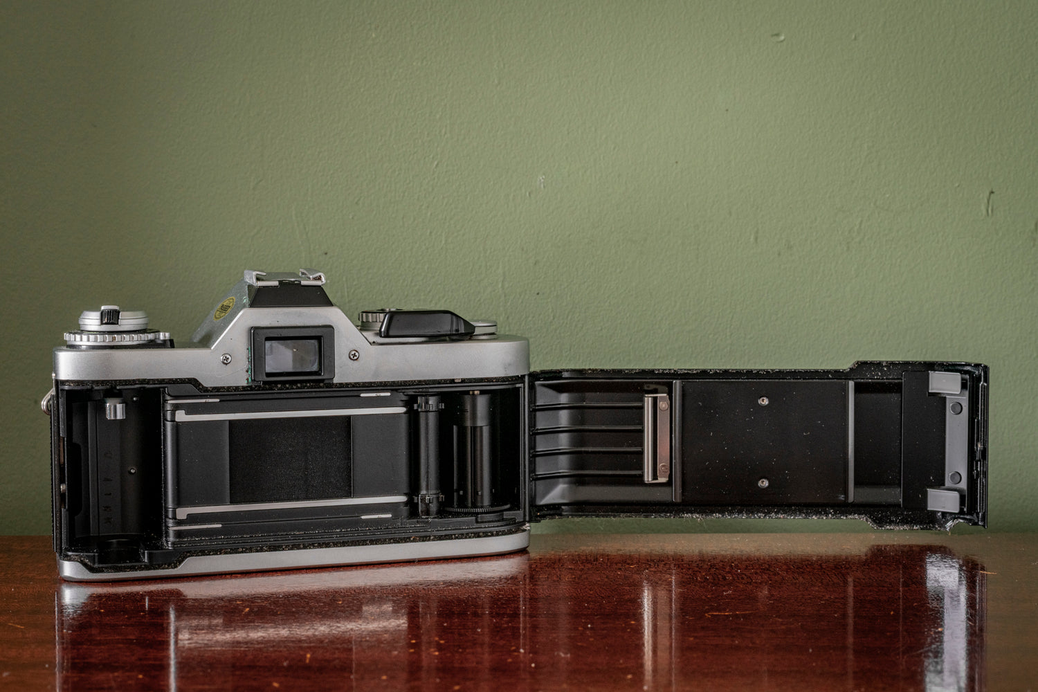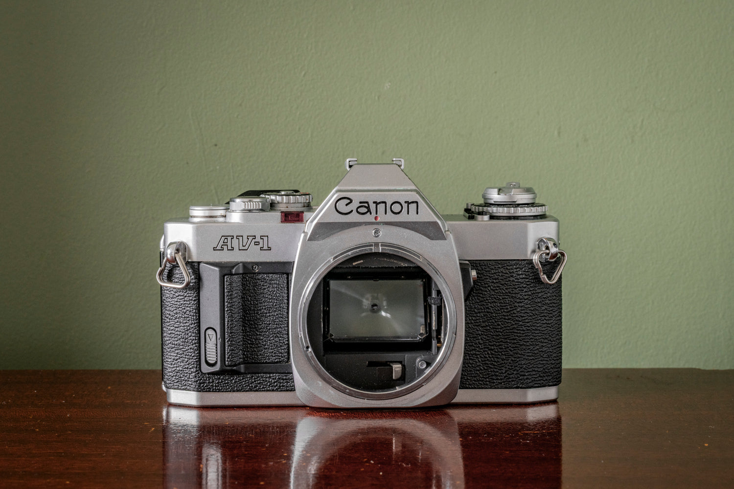 The AV-1 is very similar to the 1976 Canon AE-1 but provides aperture-priority autoexposure rather than the AE-1's shutter speed priority AE. The camera is not capable of full manual exposure. Featuring a sharp 50mm lens and a needle-based light meter, this camera is perfect for students, amateurs, or professionals.